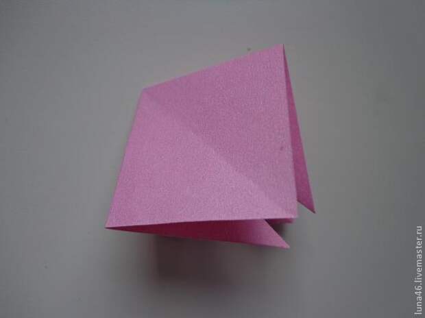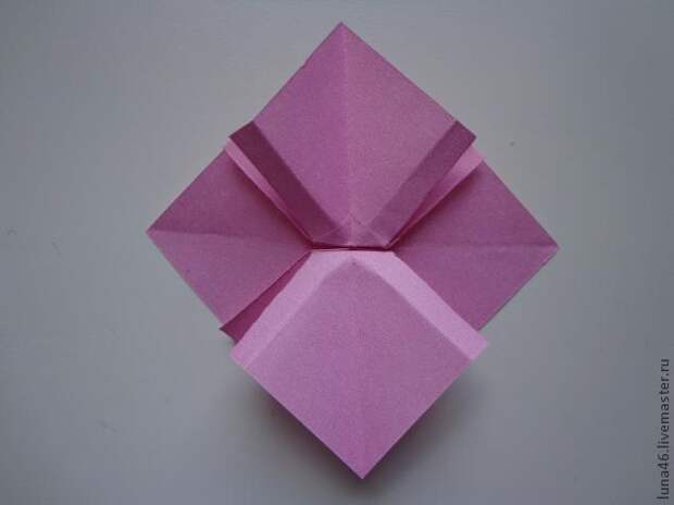 5. Раскрываем заготовку. В цетре большого квадрата появился маленький, прорабатываем пальчиками сгибы маленького квадратика и складываем заготовку, так чтобы квадратик оказался внутри.